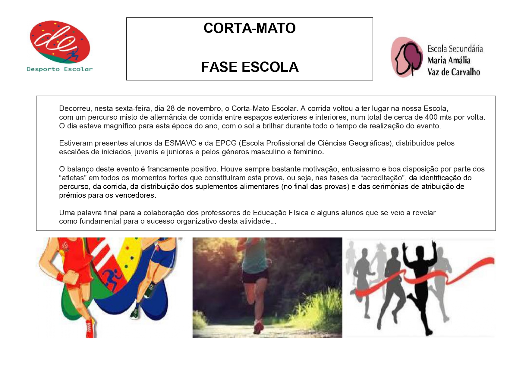 Decorreu, na passada segunda-feira, dia 25 de novembro, o Corta-Mato Escolar. Pela primeira vez, e a título experimental, a corrida teve lugar na nossa Escola, tendo os professores organizado um percurso misto, com alternância de corrida entre espaços exteriores e interiores, num total de cerca de 400 mts por volta. O dia esteve magnífico para esta época do ano, com o sol a brilhar durante todo o tempo de realização do evento.