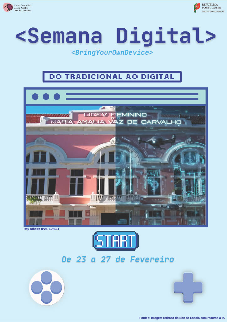 De 23 a 27 de Fevereiro, irá decorrer na nossa escola a Semana Digital. Ao longo da semana, serão desenvolvidas diversas atividades, em sala de aula, bem como no Salão Nobre e no Laboratório Digital.